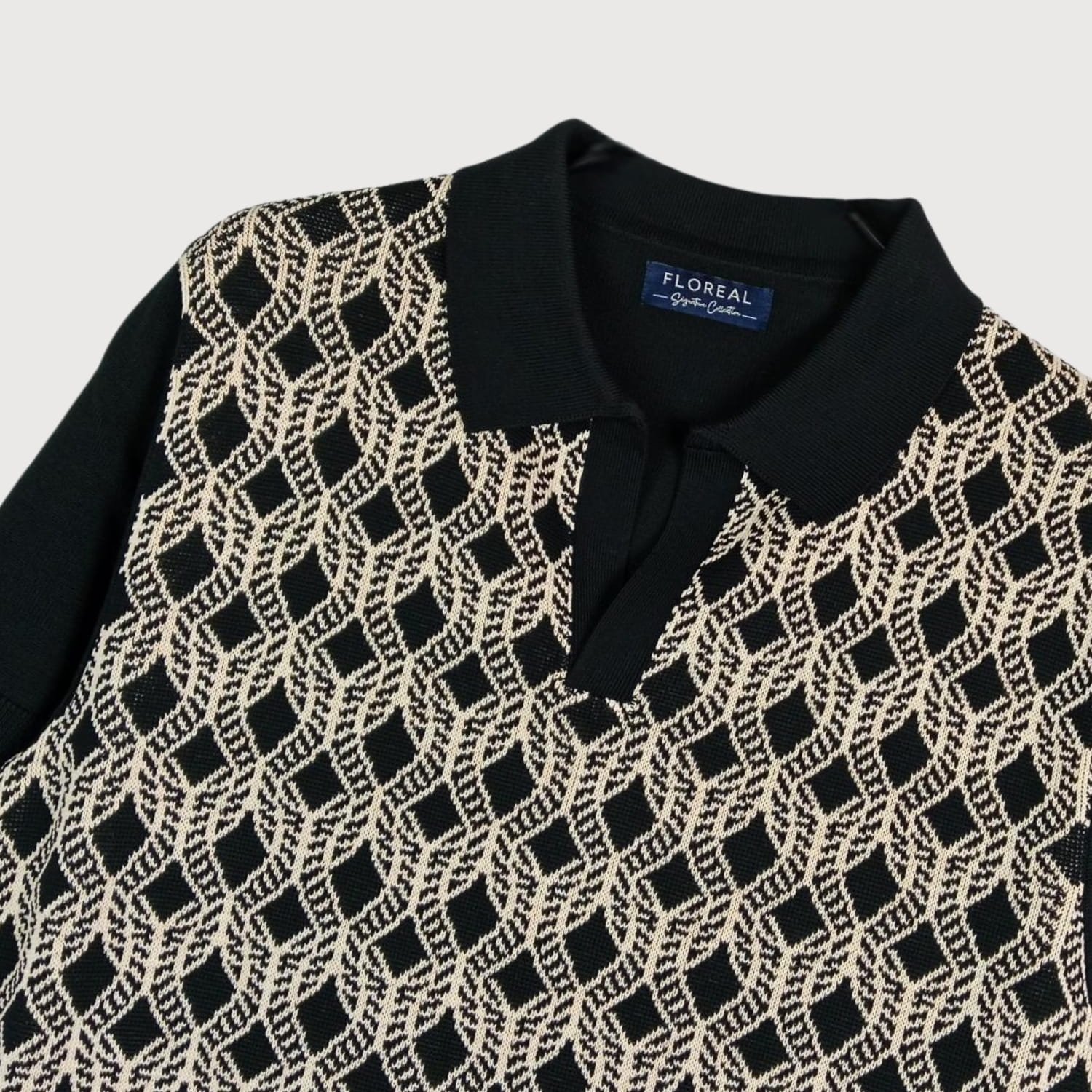 Men’s Geometric Jacquard Knit Polo – Black and Beige