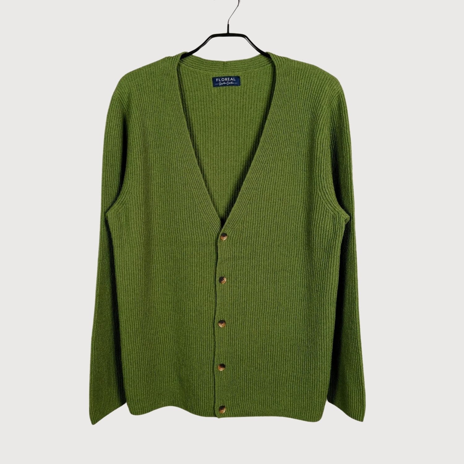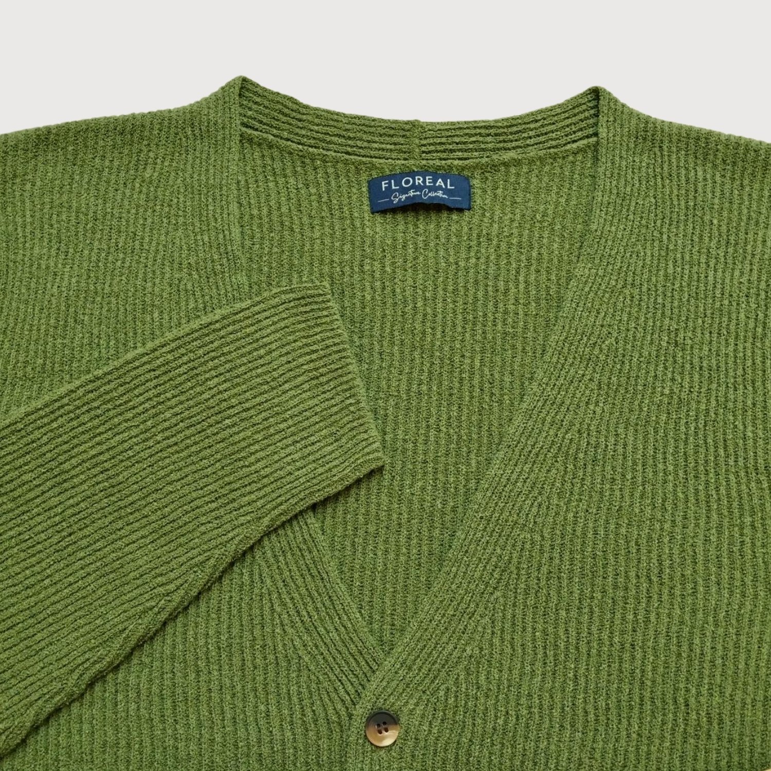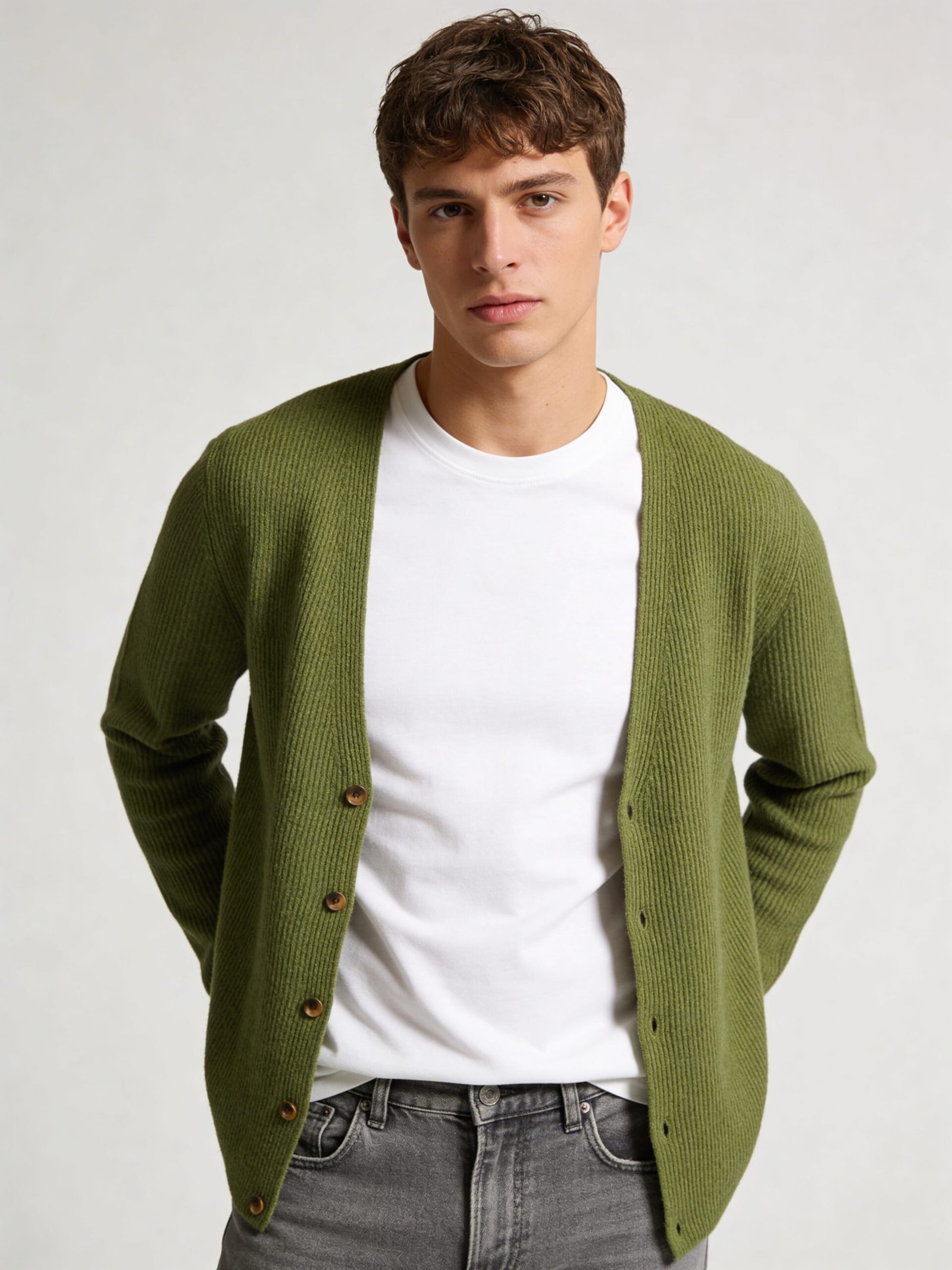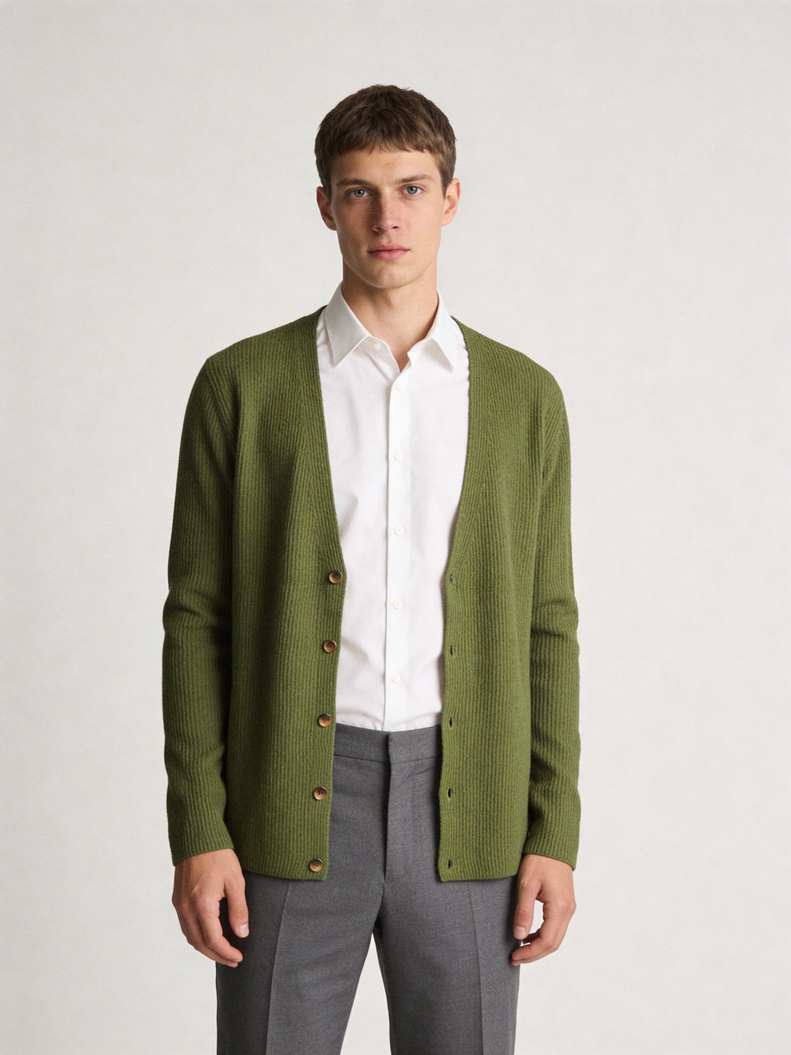Crafted with precision, this cardigan showcases a full-body vertical rib-stitch that provides both exceptional stretch and a sophisticated textural depth. The olive green tone offers a natural, earthy aesthetic that pairs easily with both formal shirts and casual tees. The deep V-neck silhouette is engineered to lay flat against the body, while the reinforced front placket is finished with tonal buttons for a cohesive, high-end appearance. The garment is constructed from a premium mid-gauge knit, offering a substantial feel without being overly bulky. The sleeves and hem are finished with integrated ribbing to ensure the garment retains its shape and provides a secure, comfortable fit at the wrists and waist. This cardigan is designed with a standard fit, allowing enough room for comfortable layering while maintaining a clean, professional profile. To preserve the elasticity of the rib-knit and the richness of the olive color, we recommend a gentle hand wash in cold water with a mild detergent. Avoid wringing or twisting the fabric; instead, gently press out excess water and lay it flat on a clean towel to dry. To maintain the integrity of the shoulder structure, store this garment folded in a cool, dry place rather than on a hanger.