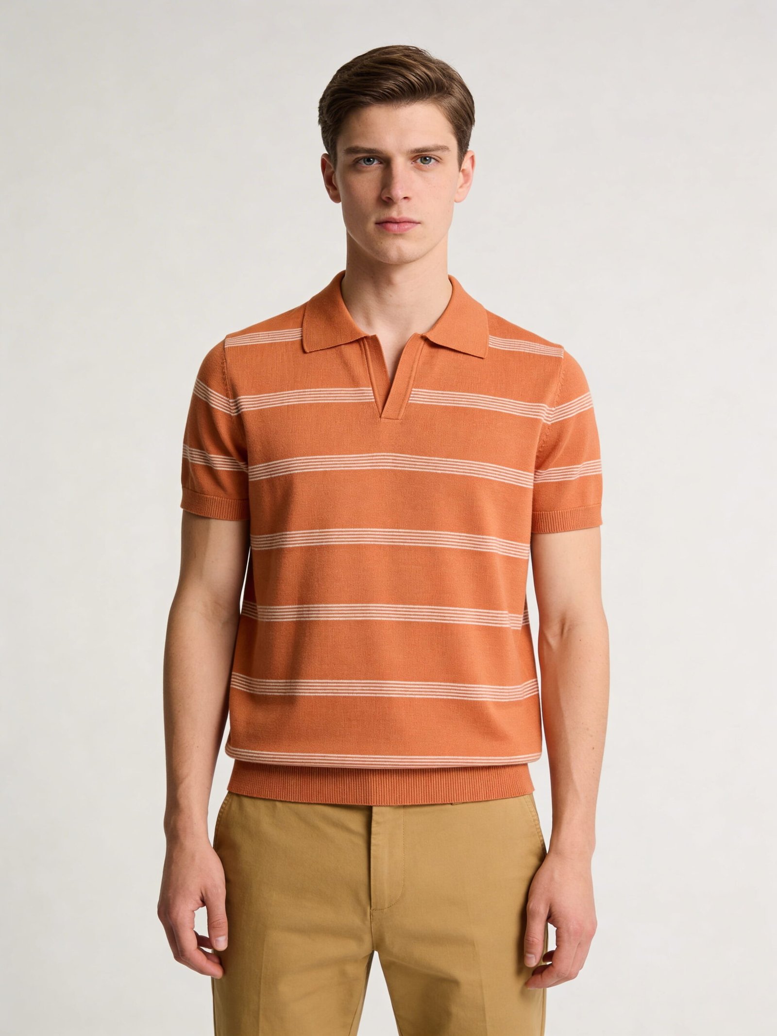 Expertly crafted in a fine-gauge knit, this polo showcases a sophisticated approach to casual wear. The garment features a vibrant terracotta base accented by horizontal off-white stripes that are grouped in a rhythmic pattern for added visual depth. The design is anchored by a sharp, buttonless V-neck collar, providing a clean and breathable neckline that transitions effortlessly from professional environments to weekend leisure. The construction utilizes high-quality yarn that provides a smooth, soft hand-feel and excellent breathability. The ribbed detailing at the sleeve cuffs and the bottom hem is designed to provide a secure fit while enhancing the garment’s structured silhouette. Every transition between the striped patterns and the solid panels is precisely executed to ensure a high-end finish consistent with luxury knitwear standards. This piece is designed with a versatile regular fit that allows for easy layering under a blazer or wearing as a standalone statement piece. To maintain the vibrant color and the precise shape of the knit, we recommend professional dry cleaning or a gentle hand wash in cold water. Always lay the item flat on a towel to dry, avoiding direct sunlight to preserve the integrity of the fibers.