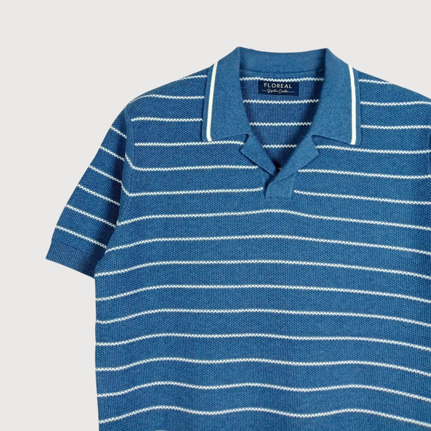 A sophisticated take on the classic summer polo, this short-sleeve sweater is crafted from a premium textured knit. Featuring a vintage-inspired open collar and crisp horizontal stripes, it offers a perfect balance of breathability and refined structure.