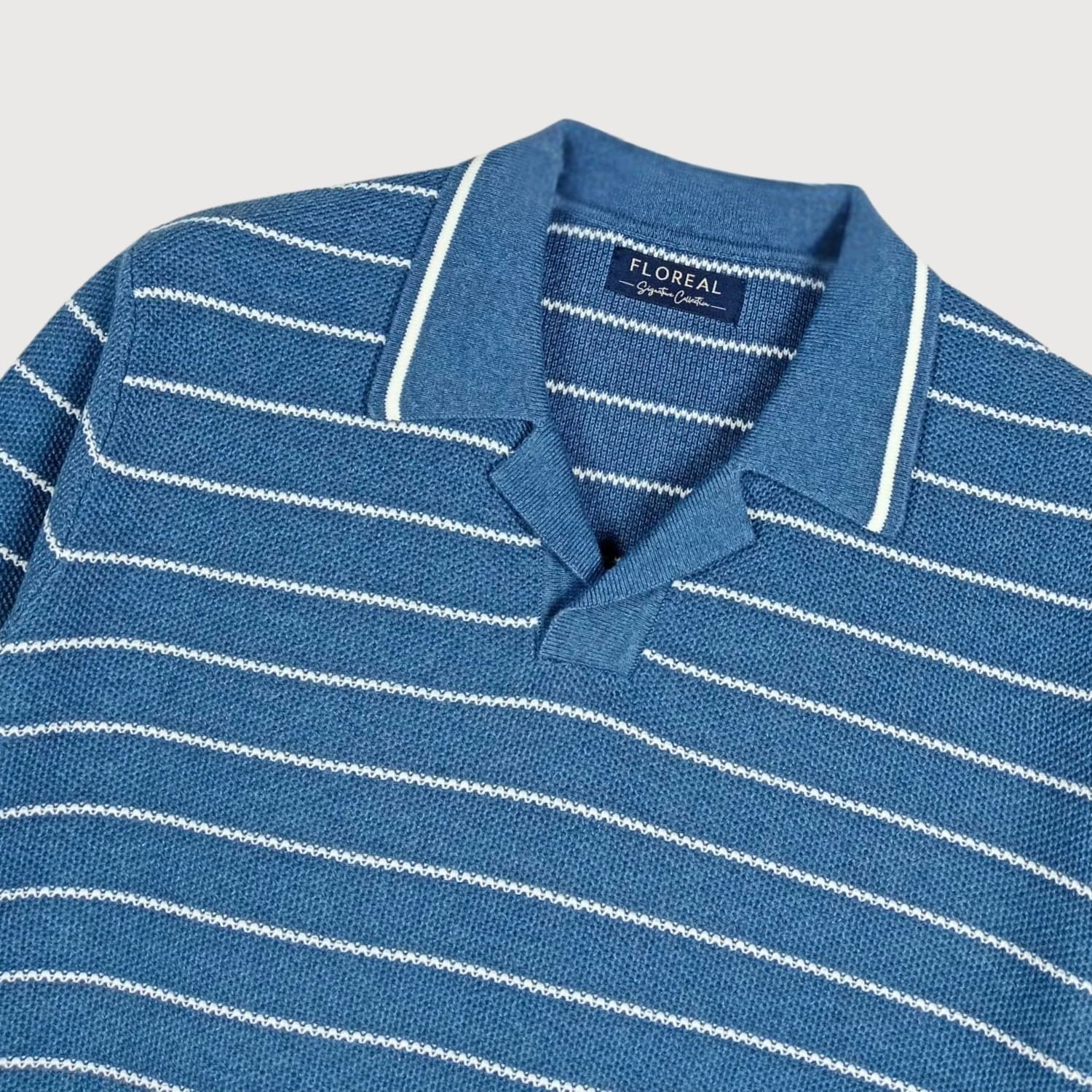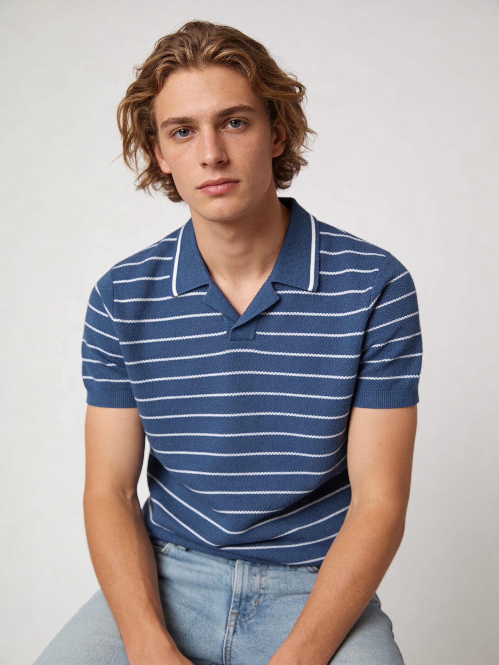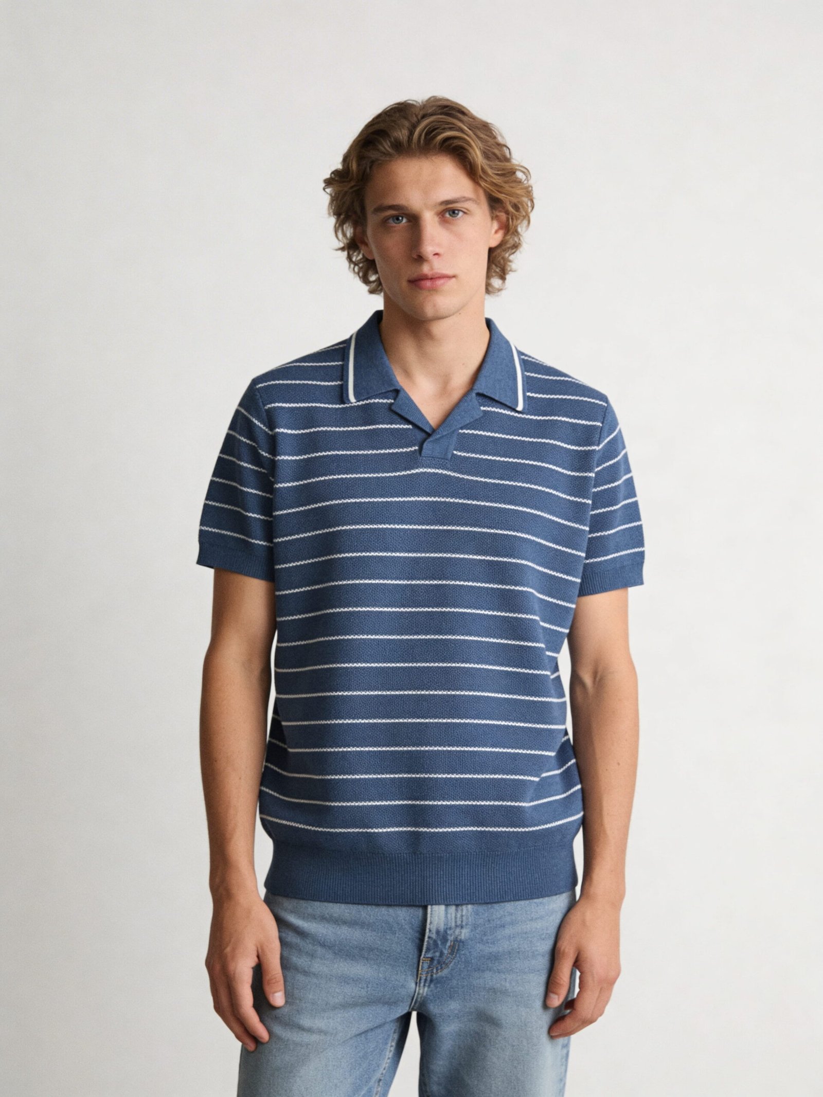 Elevate your casual wardrobe with our meticulously engineered knit polo. Unlike standard jersey polos, this piece is fully fashioned using a specialized knitting process that creates a rich, tactile surface and superior drape. The design features a classic indigo base accented by fine white horizontal micro-stripes, giving it a timeless nautical appeal. The standout feature is the resort-style collar, which is designed to sit flat without buttons for a relaxed yet sharp silhouette. The fabric is a lightweight, breathable cotton-blend knit ideal for transitional weather and layering. We have included contrasting tipping on the collar edges for a tailored finish, while the ribbed cuffs and waistband ensure the garment maintains its shape through repeated wear. The standard fit provides a soft, natural stretch inherent to high-gauge knitwear. To ensure maximum comfort, the piece features fine-gauge construction with a seamless-style integrated collar. For maintenance, we recommend hand washing or using a delicate machine cycle in cold water to keep the knit structure intact. Always lay the garment flat to dry to prevent stretching.